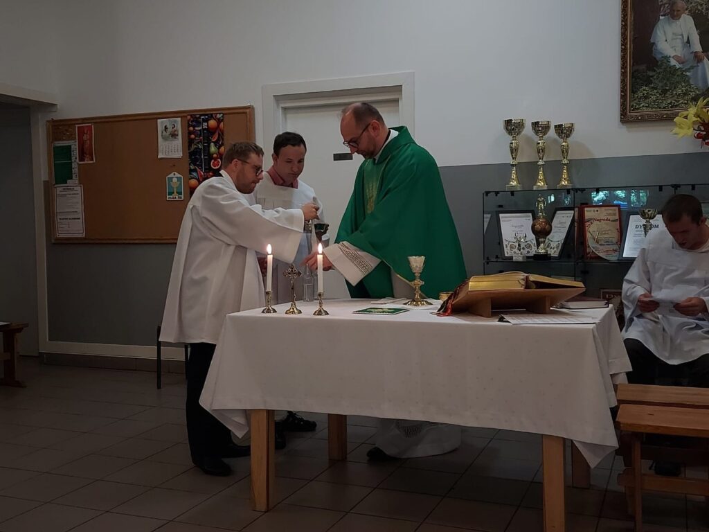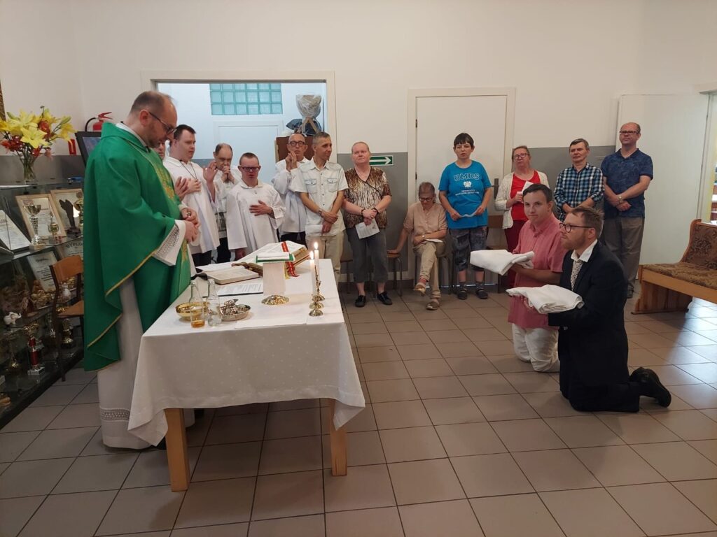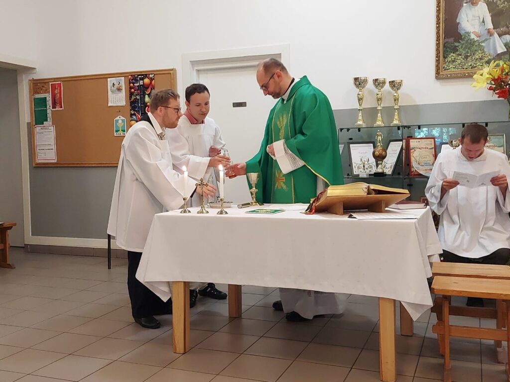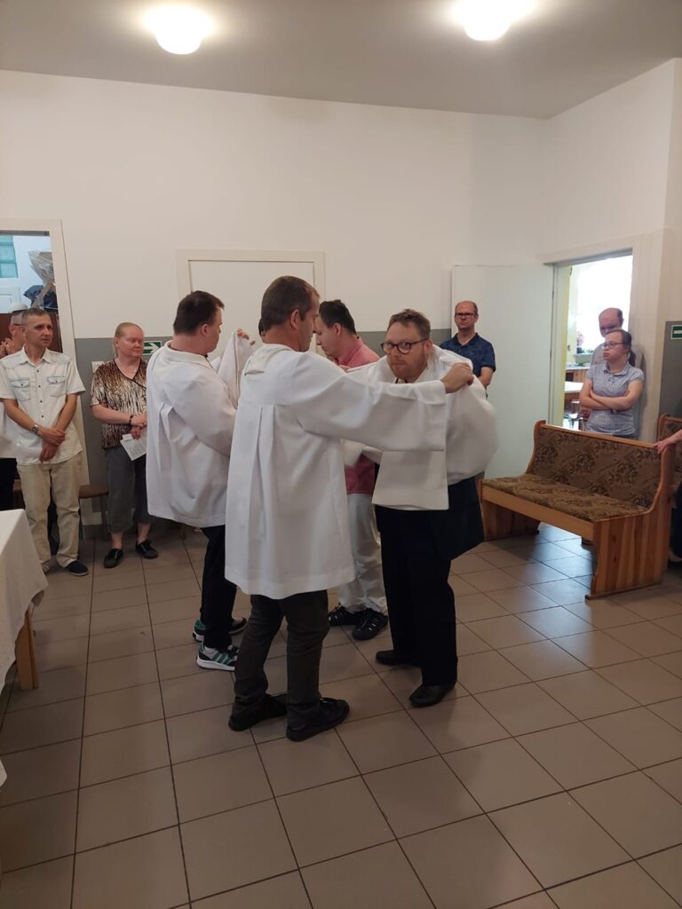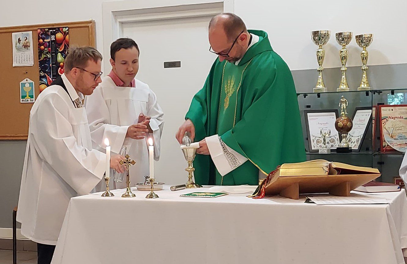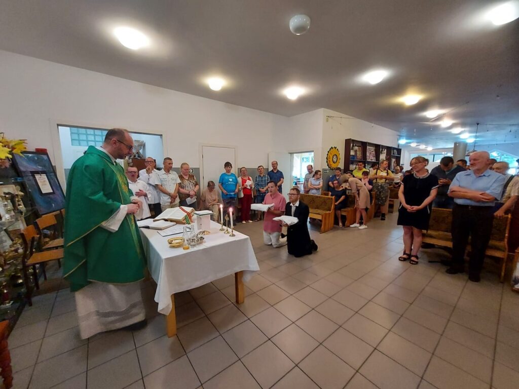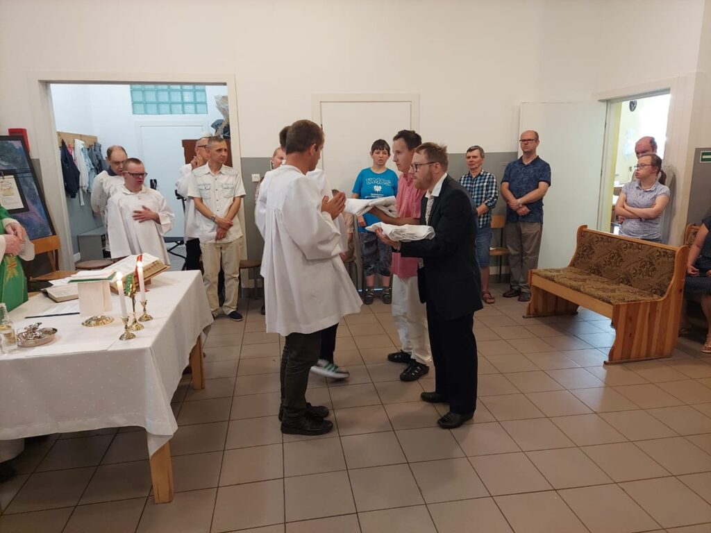 Podczas Mszy Świętej 04.07.2024 r. nowi uczestnicy z WTZ przy ul. Gospodarczej dołączyli do grona ministrantów. Mateusz Ś. oraz Filip R. zostali pouczeni i przygotowali się służyć Bogu i ludziom podczas liturgii. Komże zostały wręczone kandydatom przez doświadczonych już ministrantów, a następnie poświęcone przez ks. Krzysztofa. Wszyscy zgromadzeni przywitali nowych ministrantów gromkimi brawami. Podczas Mszy Świętej Mateusz i Filip po raz pierwszy służyli przy ołtarzu.