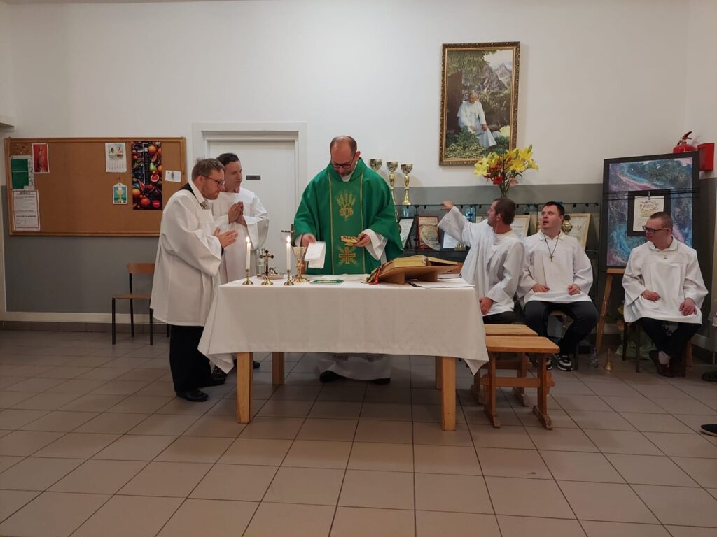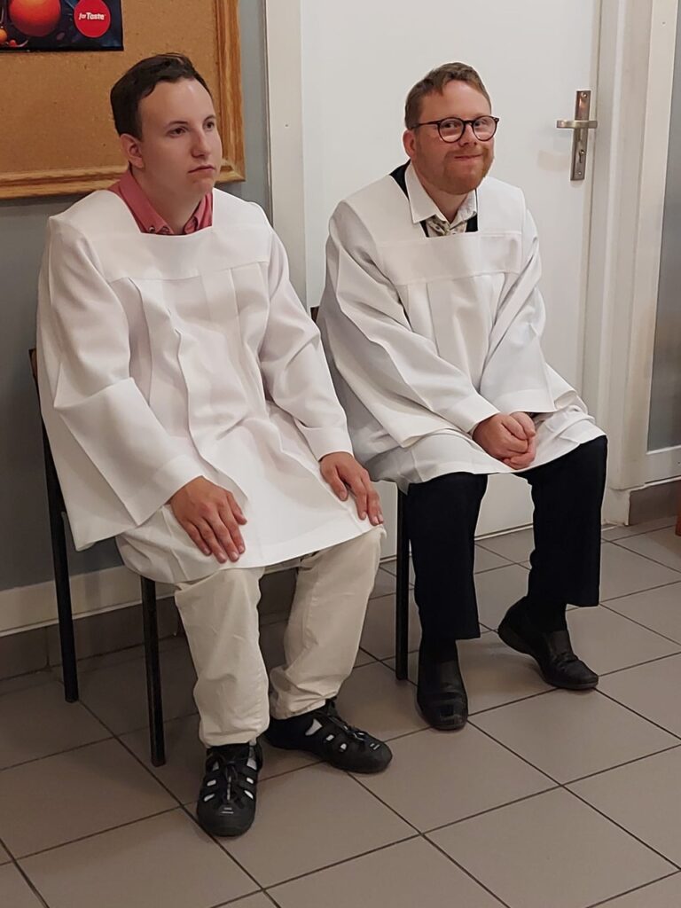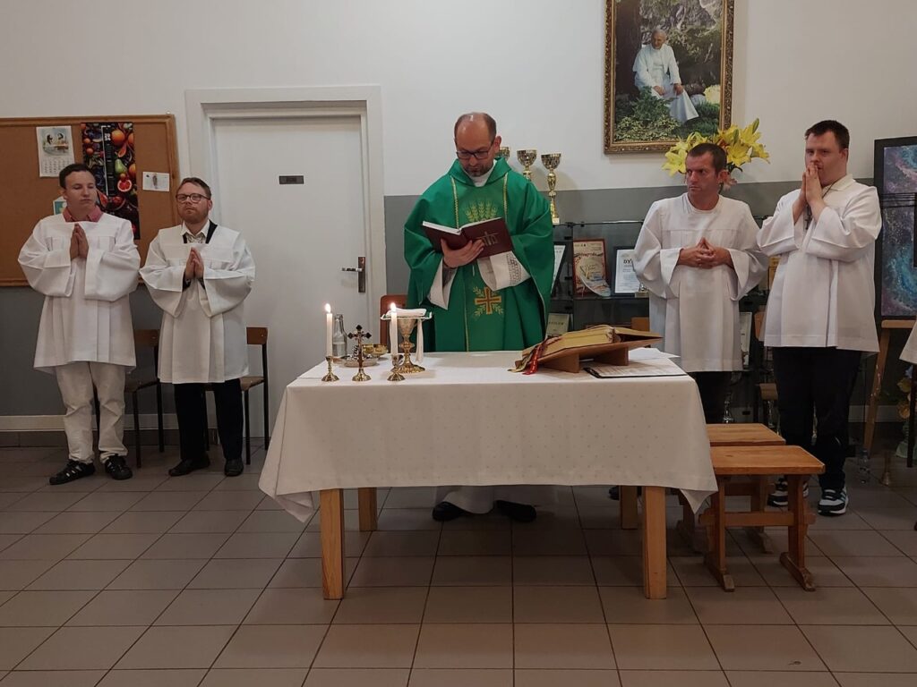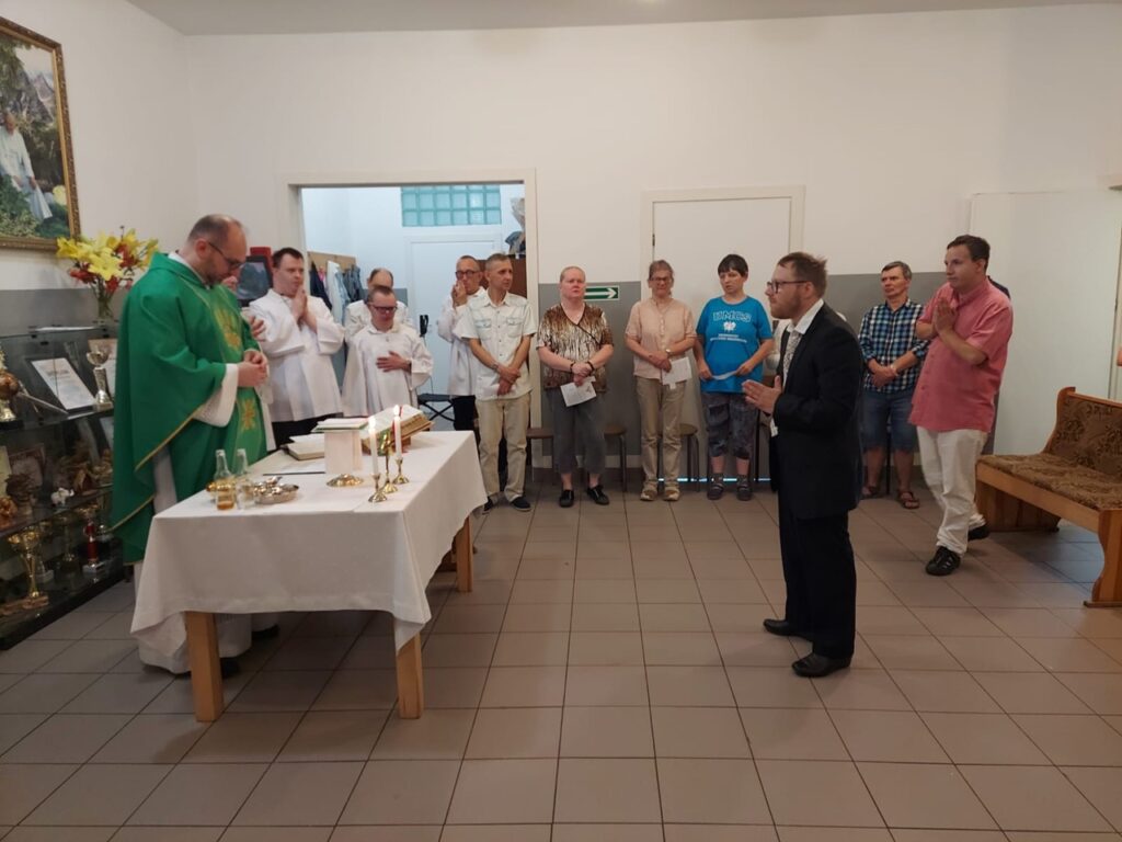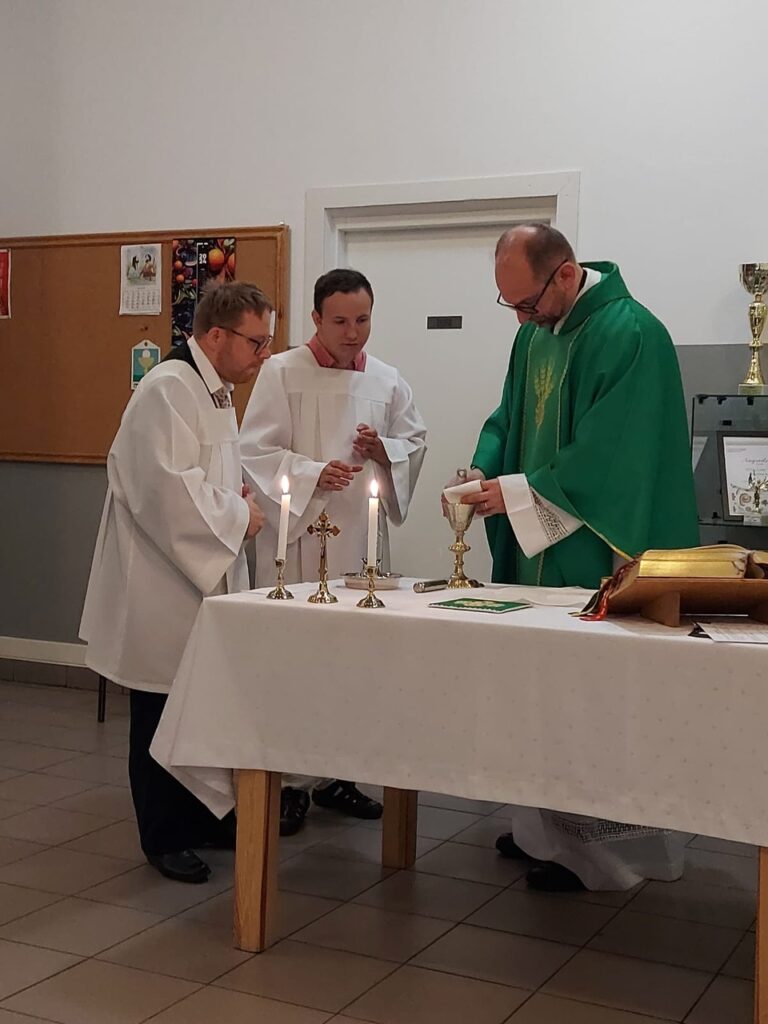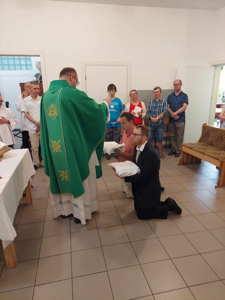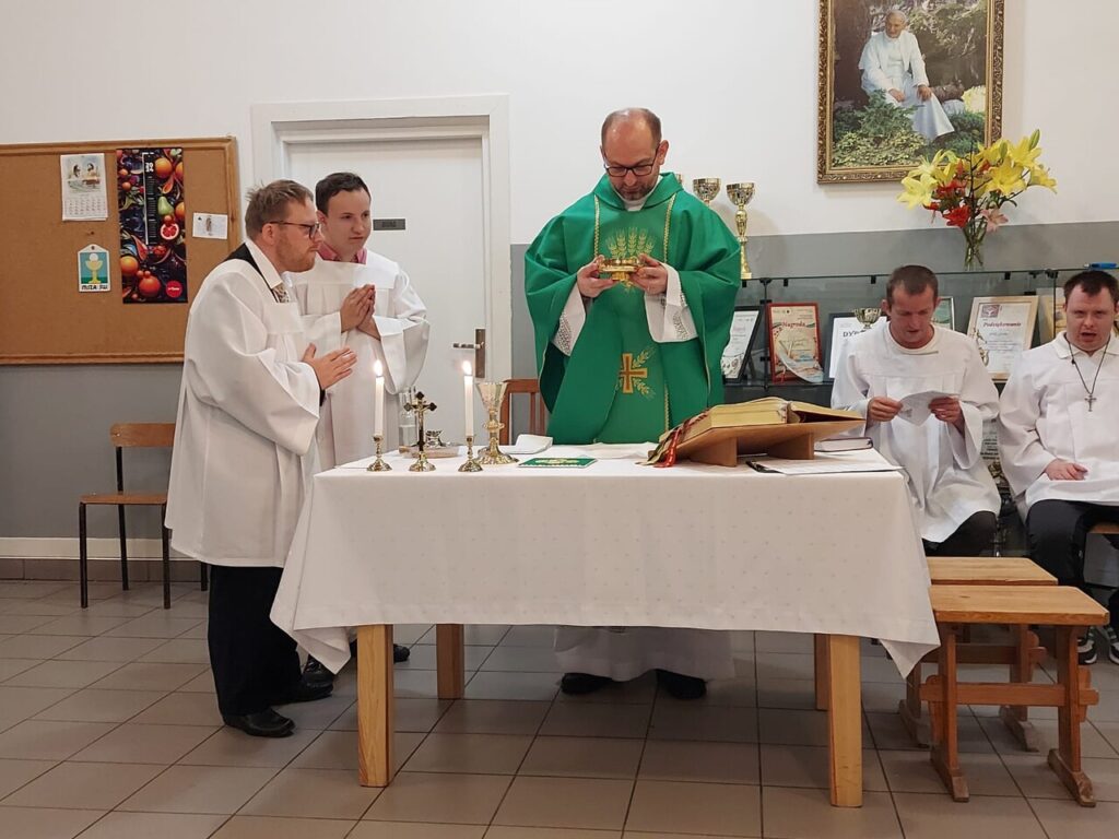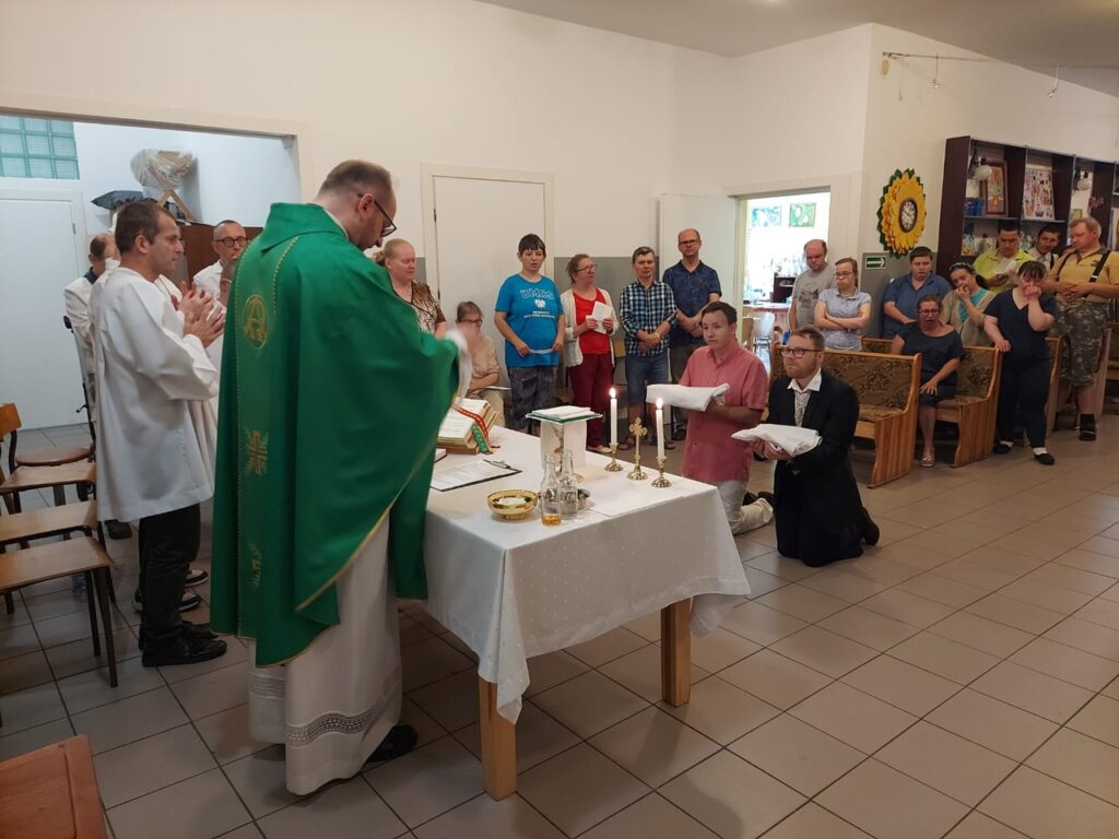 Podczas Mszy Świętej 04.07.2024 r. nowi uczestnicy z WTZ przy ul. Gospodarczej dołączyli do grona ministrantów. Mateusz Ś. oraz Filip R. zostali pouczeni i przygotowali się służyć Bogu i ludziom podczas liturgii. Komże zostały wręczone kandydatom przez doświadczonych już ministrantów, a następnie poświęcone przez ks. Krzysztofa. Wszyscy zgromadzeni przywitali nowych ministrantów gromkimi brawami. Podczas Mszy Świętej Mateusz i Filip po raz pierwszy służyli przy ołtarzu.