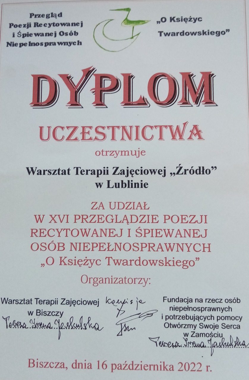 Już po raz XVI w Biszczy odbył się Przegląd Poezji Śpiewanej i Recytowanej Osób Niepełnosprawnych. Udział wzięło około 100 osób z 25 placówek z Polski i Ukrainy. Nasze WTZ reprezentowało czterech uczestników, których recytowane wiersze zostały nagrane i przesłane do organizatorów. 09.11.2022 mieliśmy zaszczyt wysłuchać wierszy ks. Jana Twardowskiego oraz uczestniczyć w uroczystości wręczania dyplomów i nagród dla: Joanny G., Magdaleny K., Marcina Z., Kamila M.