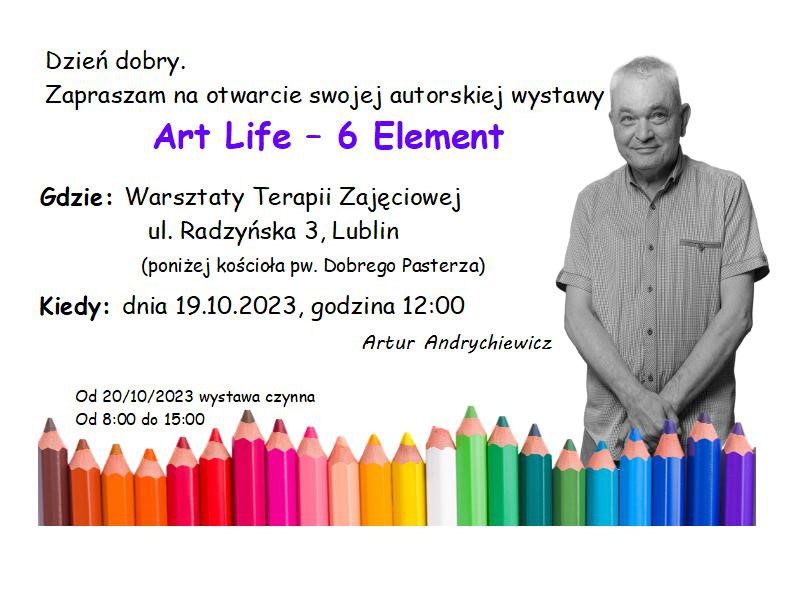 Serdecznie zapraszamy do obejrzenia autorskiej wystawy Artura Andrychiewicza, uczestnika naszego WTZ. Otwarcie wystawy w Galerii „Źródło”, przy ul Radzyńskiej 3 w Lublinie, odbędzie się 19 października 2023 r.